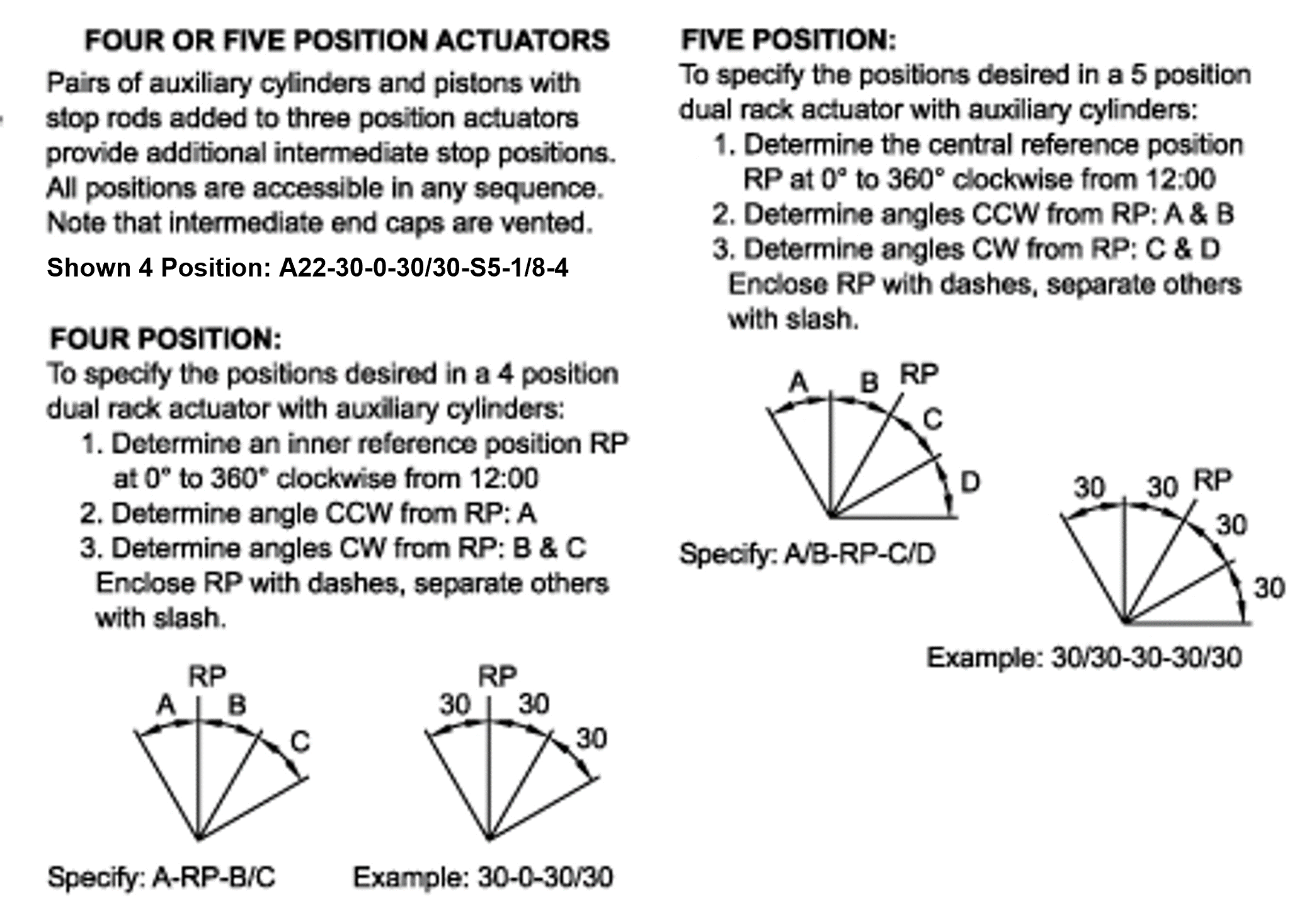 With internal stops and one or two sets of auxiliary cylinders used for the two or three intermediate positions, respectively, our four and five-position actuators are built to resemble their two-position counterparts, except for the external auxiliary cylinders that add to the overall length of the unit.